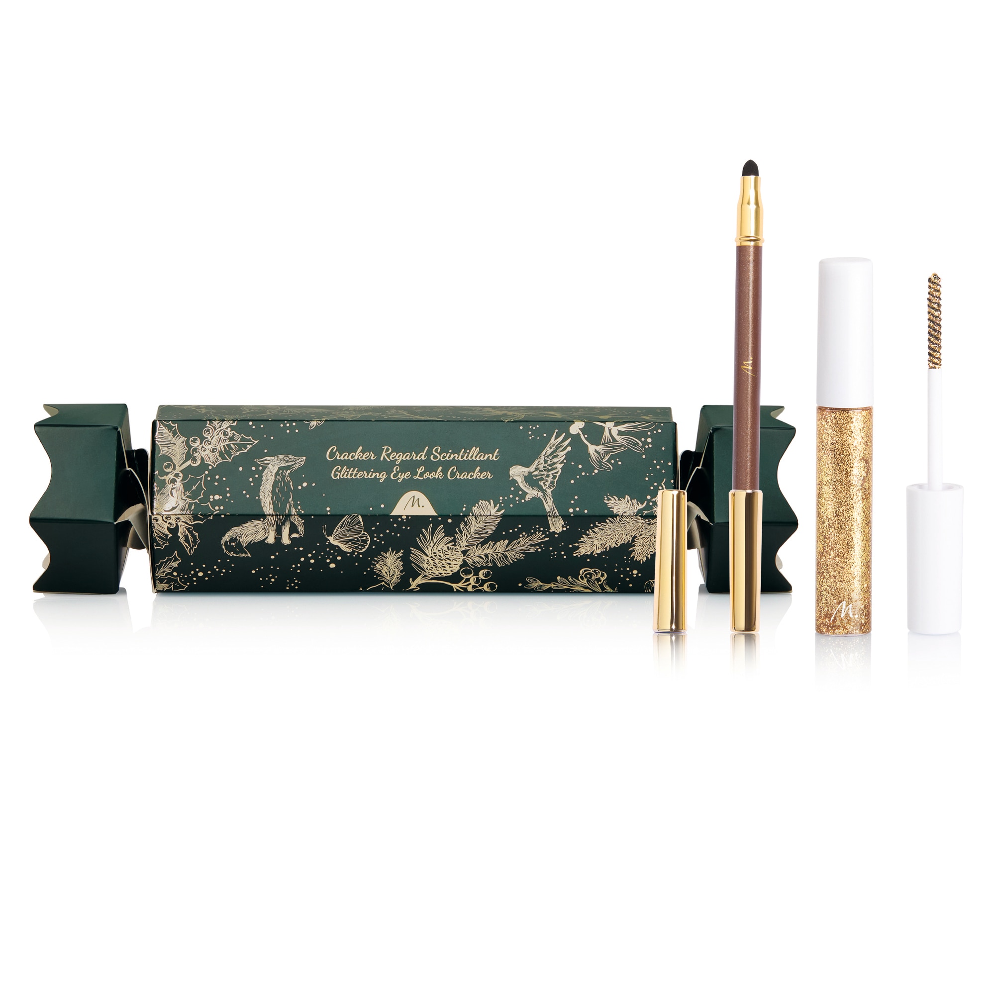Entdecken Sie die Überraschungen, die in diesem hübschen Cracker versteckt sind, und sorgen Sie für einen festlichen Blick! Er enthält: 1 goldene Glitzer-Mascara und 1 goldbraunen, glitzernden Eyeliner mit zwei Spitzen.